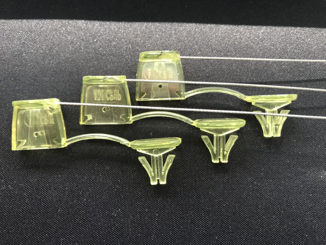 • Натягиваем конец троса с противоположной стороны, вставляем защелку в отверстие на корпусе пломбы до характерного щелчка.